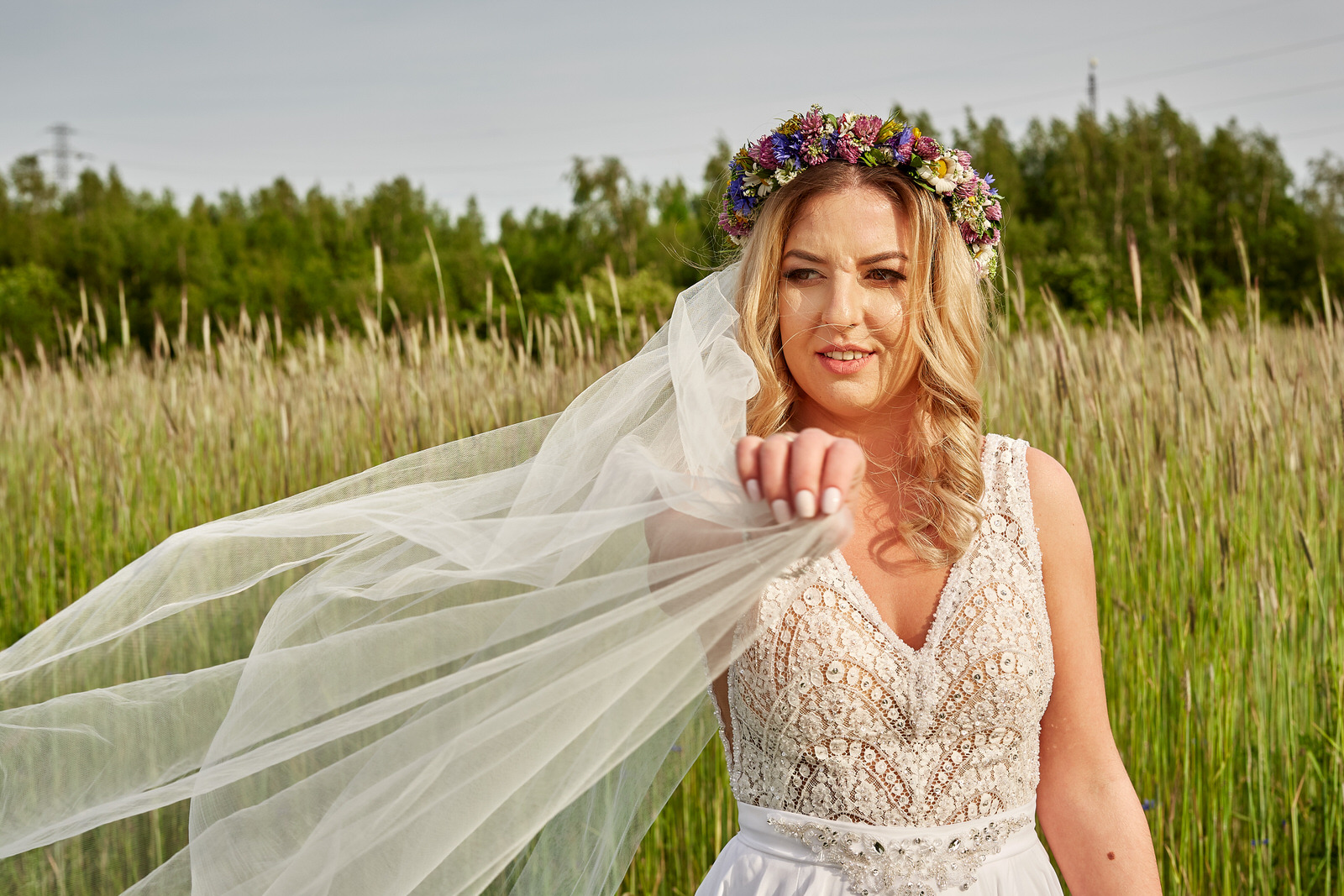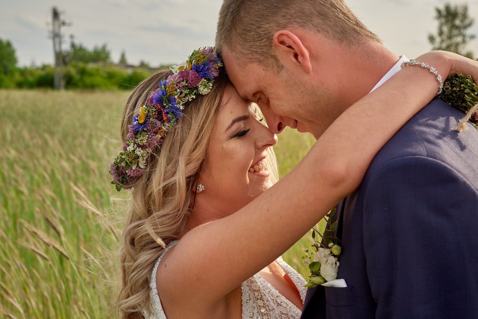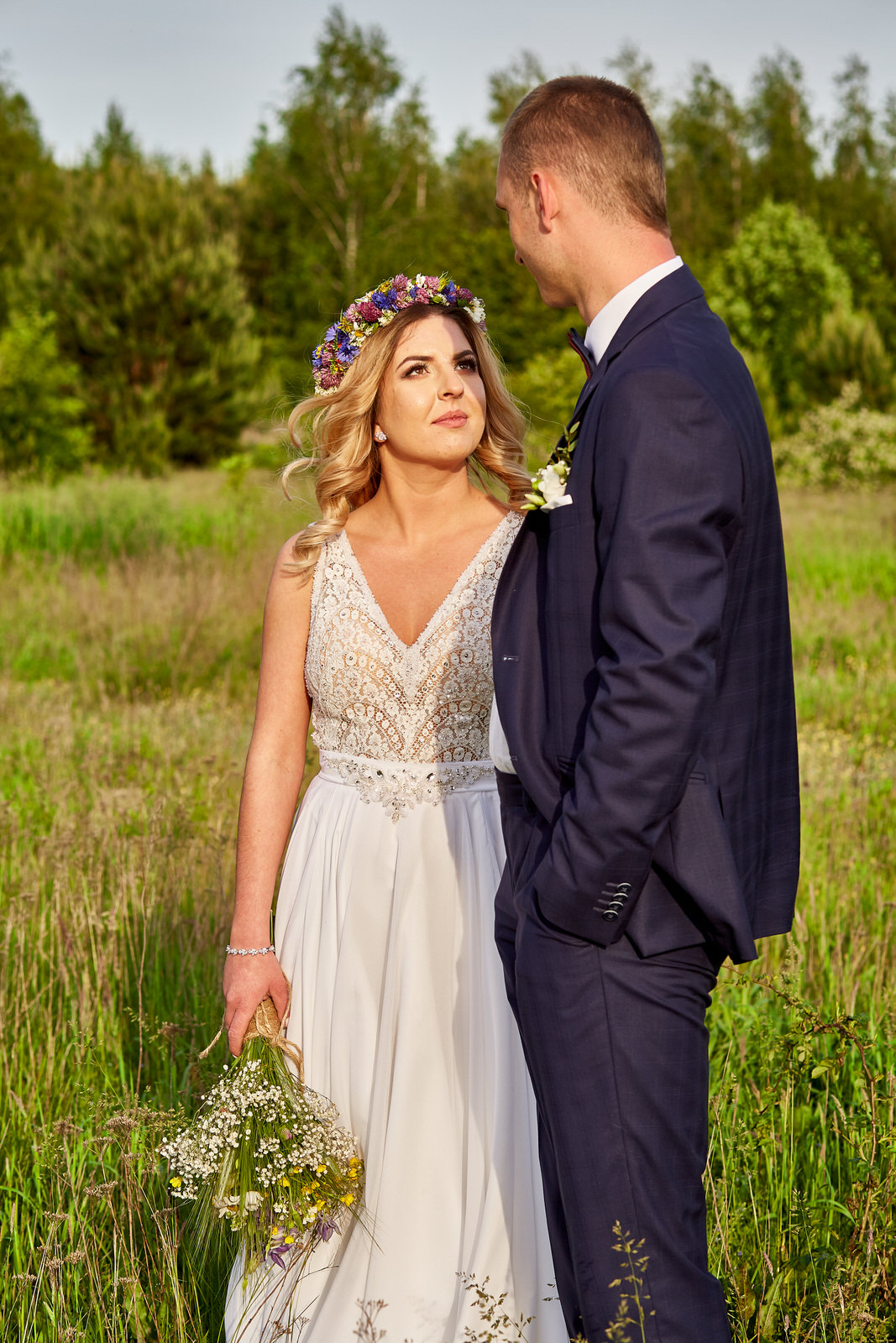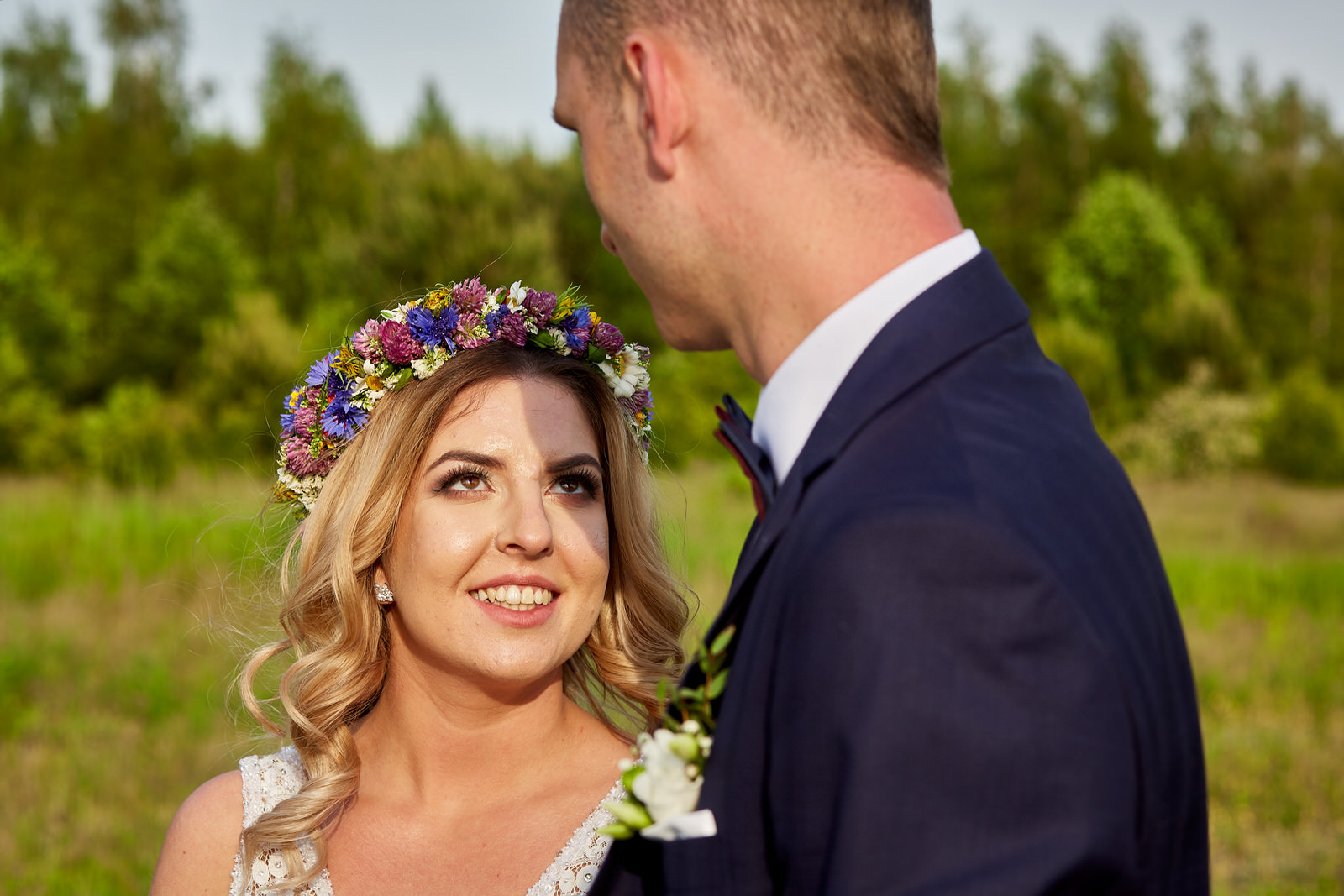 Jest dużo kwiatów, kolorowy wianek we włosach Żony, równie kolorowy bukiet w jej dłoniach. Perfekcyjny makijaż i manicure, starannie ułożona fryzura – ale wiemy już, że ta Para to perfekcjoniści. Efekt jest więc przyjemny dla oka, a przy tym bardzo naturalny.