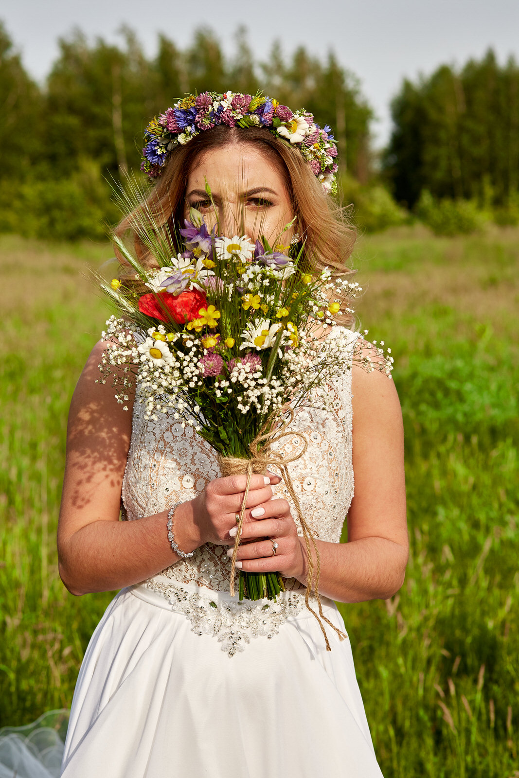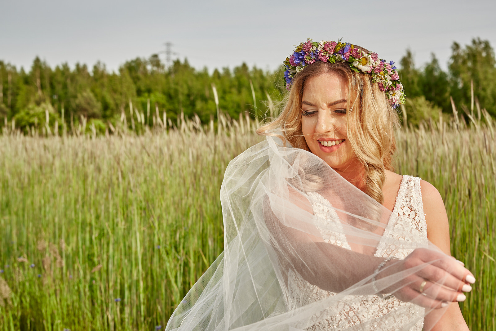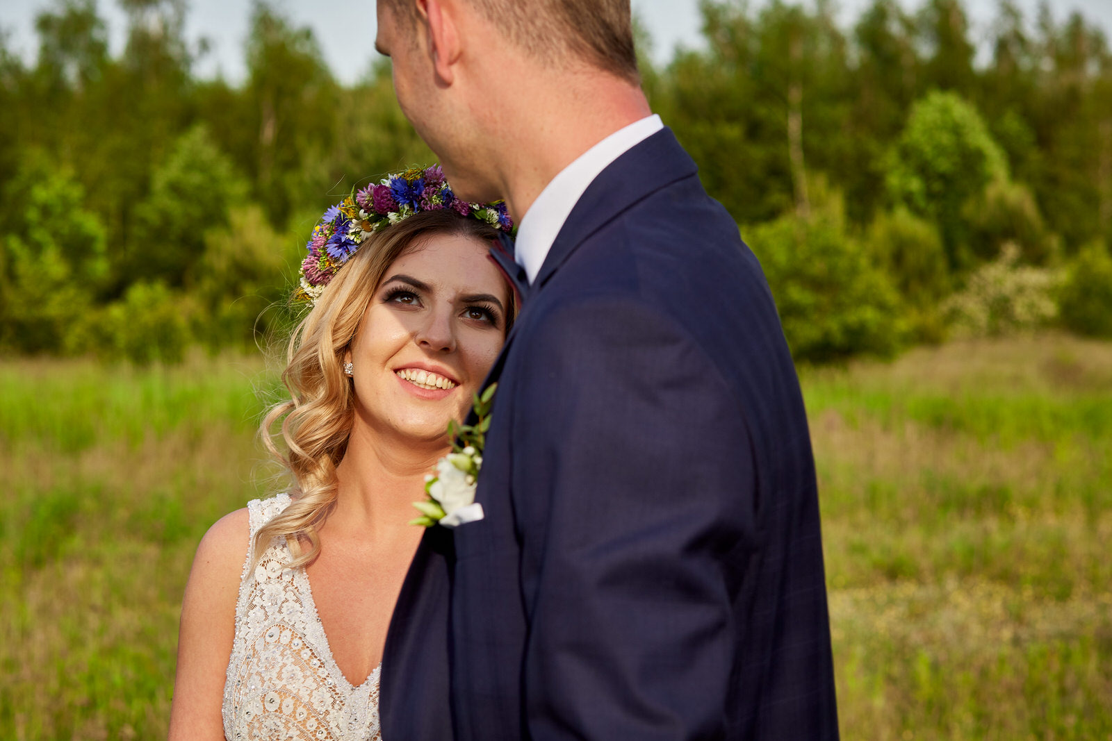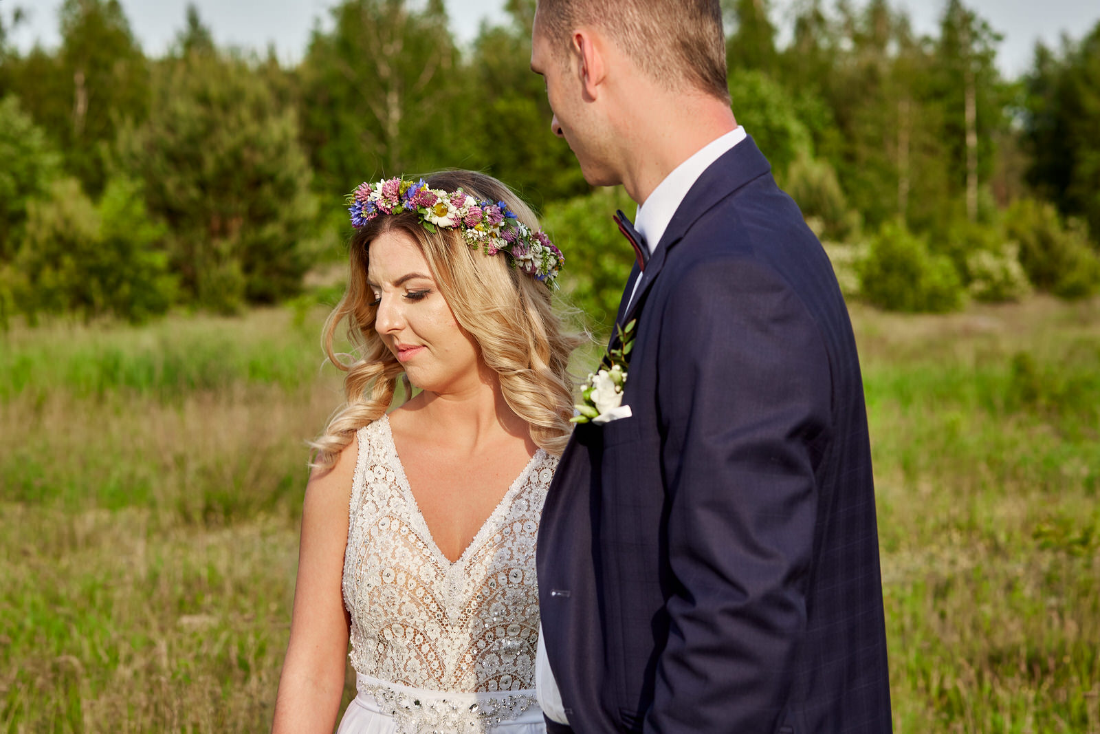 Jest dużo kwiatów, kolorowy wianek we włosach Żony, równie kolorowy bukiet w jej dłoniach. Perfekcyjny makijaż i manicure, starannie ułożona fryzura – ale wiemy już, że ta Para to perfekcjoniści. Efekt jest więc przyjemny dla oka, a przy tym bardzo naturalny.