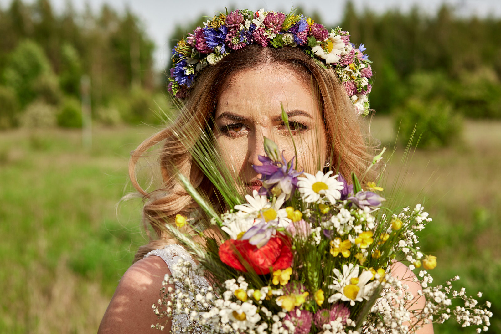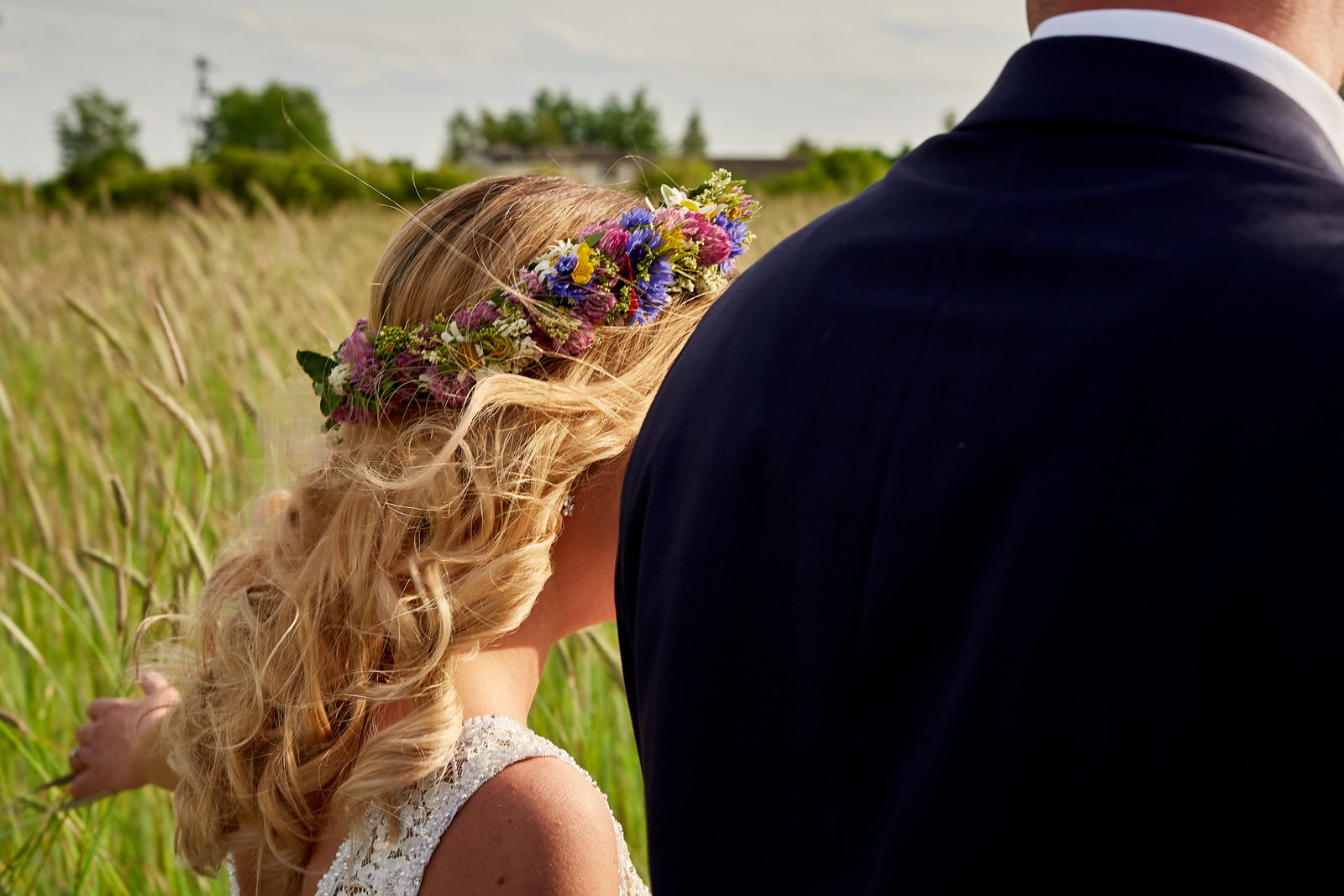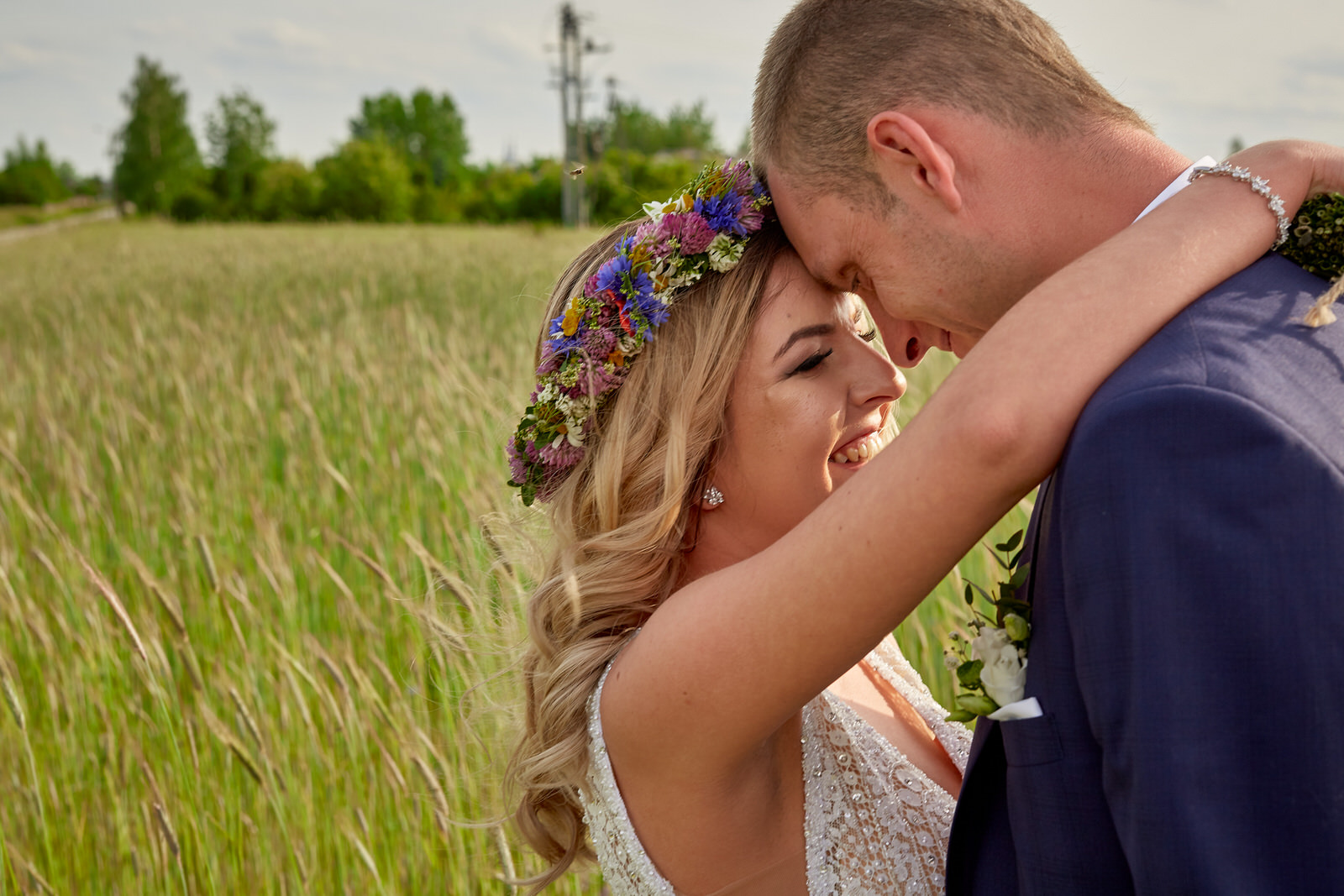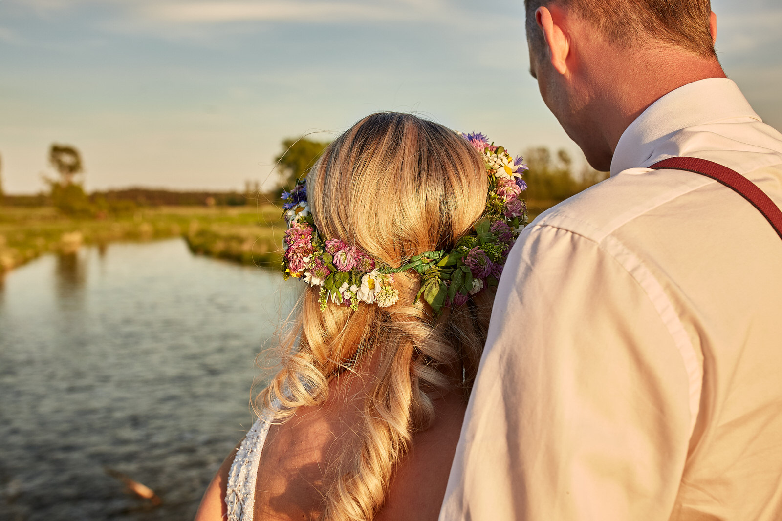Jest dużo kwiatów, kolorowy wianek we włosach Żony, równie kolorowy bukiet w jej dłoniach. Perfekcyjny makijaż i manicure, starannie ułożona fryzura – ale wiemy już, że ta Para to perfekcjoniści. Efekt jest więc przyjemny dla oka, a przy tym bardzo naturalny.
